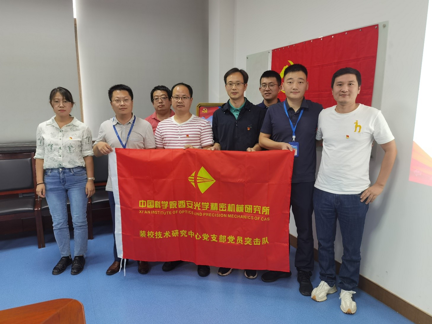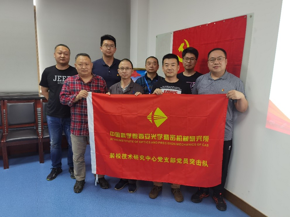 座談會后舉行了“黨員突擊隊”授旗儀式。王鋒、葛永嬌、楊洪濤、郭高、康世發(fā)等分別為空間光學裝配團隊、大口徑光學裝配團隊及精密機械裝配團隊授“黨員突擊隊”隊旗,并向廣大黨員同志發(fā)出號召:希望廣大黨員強化責任擔當,攻堅克難、吃苦奉獻,真正起到先鋒模范帶頭作用,團結帶領組內職工群眾,努力保證科研生產,以一絲不茍的態(tài)度對待產品,高質量按期完成任務。把學習黨史同推動科研工作結合起來,把學習成效轉化為工作動力和成效。